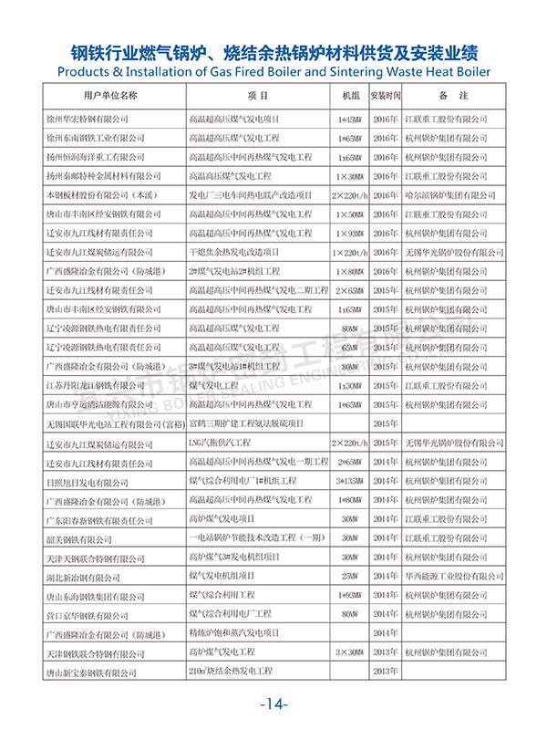 鋼鐵行業(yè)燃?xì)忮仩t、燒結(jié)余熱鍋爐材料供貨及安裝業(yè)績(jī)(三)